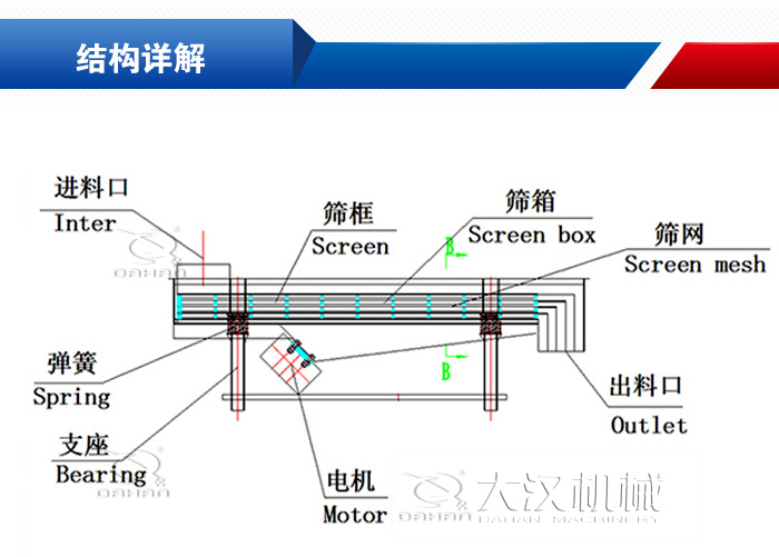 直線篩分機簡稱直線篩,是一種針對粉狀及顆粒狀物料篩分的一種振動篩,大漢直線篩分機可以按照用戶要求設計成單層或者多層,單層用戶簡單的除雜,而多層可以對物料進行分級,高層數(shù)可以達到5層,另外,還有碳鋼和不銹鋼兩種材質可以供用戶選擇,適用于篩分0.74mm-10mm,含水量在7%的不含粘性物料的所有干式物料。