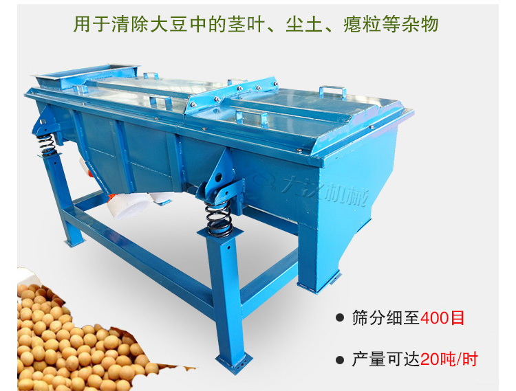 大豆振動篩主要是在大豆入倉前,將大豆中的秸稈、石子、麻繩、結(jié)團物等的大塊雜物以及細小的灰塵篩去,保證成品質(zhì)量。