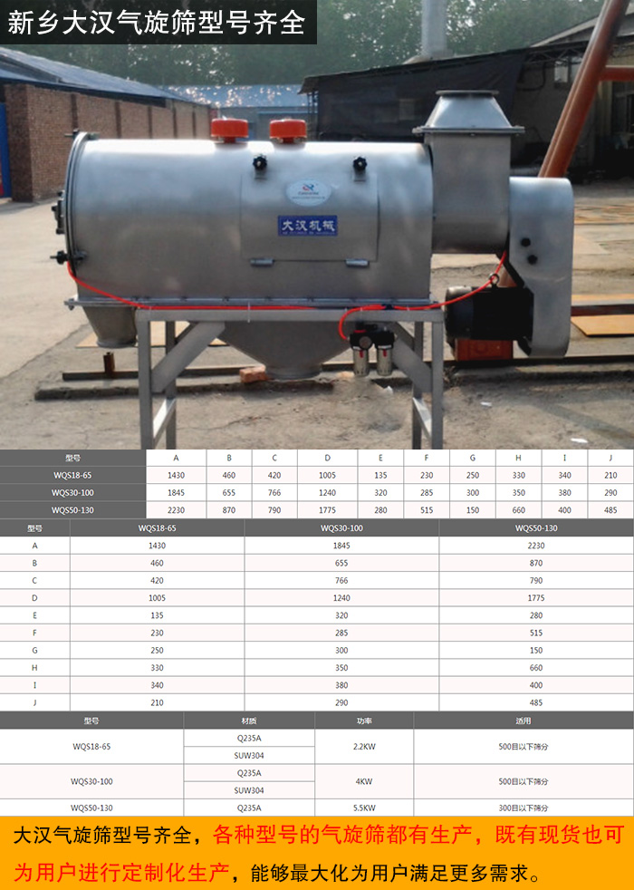 新鄉(xiāng)大漢作為知名的氣旋篩生產(chǎn)廠家,生產(chǎn)的該設(shè)備型號(hào)齊全,且各種型號(hào)的氣旋篩都有生產(chǎn),既有現(xiàn)貨也可為用戶進(jìn)行定制化生產(chǎn),能夠大化為用戶滿足更多需求。
