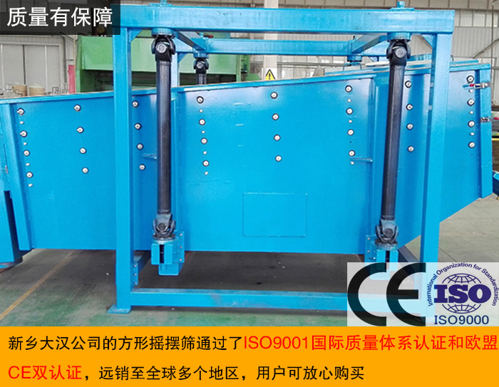 產(chǎn)品質(zhì)量是購(gòu)買方形搖擺篩時(shí)需要考慮的首要因素,新鄉(xiāng)大漢20多年一直從事于振動(dòng)篩分設(shè)備的研發(fā)與,有著豐富的生產(chǎn)經(jīng)驗(yàn),擁有10000平方米的標(biāo)準(zhǔn)化現(xiàn)代工業(yè)廠房,專業(yè)研發(fā)、生產(chǎn)、銷售團(tuán)隊(duì),新鄉(xiāng)大漢公司的方形搖擺篩通過了ISO9001國(guó)際質(zhì)量體系認(rèn)證和歐盟CE雙認(rèn)證,憑借著的產(chǎn)品質(zhì)量,方形搖擺篩設(shè)備遠(yuǎn)銷至全球多個(gè)地區(qū),用戶可放心購(gòu)買。