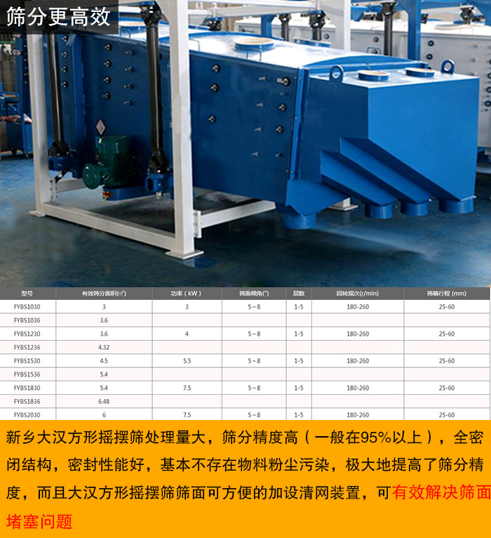新鄉(xiāng)大漢方形搖擺篩處理量大,篩分精度高(一般在95%以上),全密閉結(jié)構(gòu),密封性能好,基本不存在物料粉塵污染,極大地提高了篩分精度,而且大漢方形搖擺篩篩面可方便的加設(shè)清網(wǎng)裝置,可有效解決篩面堵塞問題。