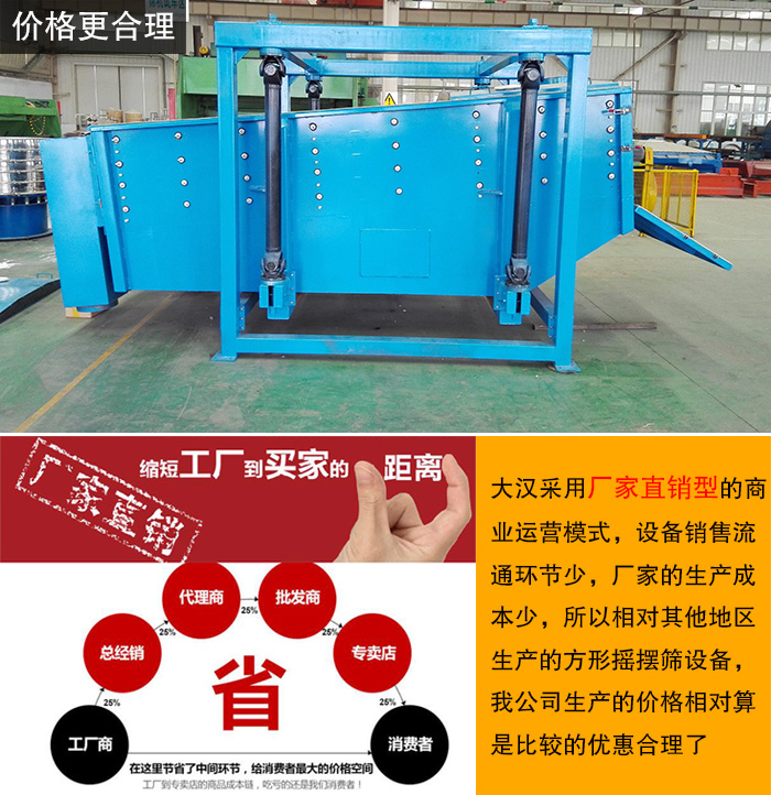 方形搖擺價(jià)格定位因不同廠家、不同設(shè)備選型等原因而有所不同,大漢采用廠家直銷型的商業(yè)運(yùn)營(yíng)模式,設(shè)備銷售流通環(huán)節(jié)少,廠家的生產(chǎn)成本少,所以相對(duì)其他地區(qū)生產(chǎn)的方形搖擺篩設(shè)備,我公司生產(chǎn)的價(jià)格相對(duì)算是比較的優(yōu)惠合理了。