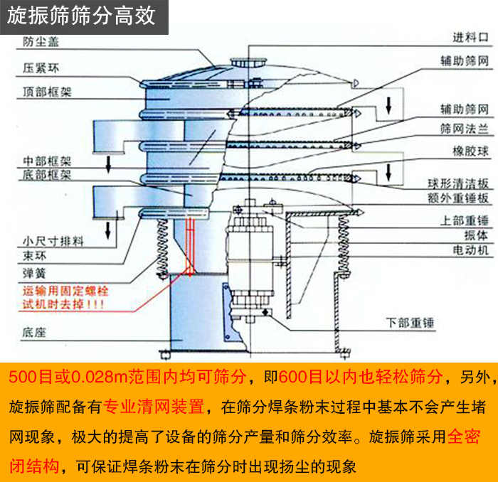 旋振篩作為高精細(xì)細(xì)粉篩分設(shè)備,其篩分物料范圍廣,無論物料的干與濕,精細(xì)與粗糙,重與輕,只要在500目或0.028m范圍內(nèi)均可篩分,即使物料是液體的或漿狀的只要在600目以內(nèi)也輕松篩分,另外,旋振篩配備有專業(yè)清網(wǎng)裝置,在篩分物料的過程中基本不會產(chǎn)生堵網(wǎng)現(xiàn)象,極大的提高了設(shè)備的篩分產(chǎn)量和篩分效率。旋振篩采用全密閉結(jié)構(gòu),可保證焊條粉末在篩分時出現(xiàn)揚塵的現(xiàn)象。