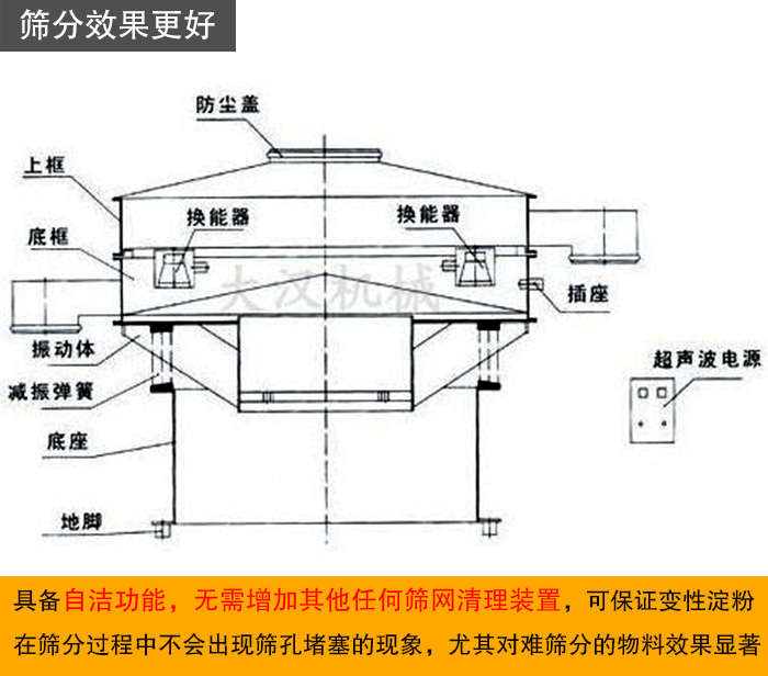 綜上所述,變性淀粉在篩分過程中可以使用超聲波振動篩,如果想進一步提高變性淀粉的篩分產(chǎn)量,大漢廠家還有在搖擺篩基礎(chǔ)上加裝超聲波裝置用以滿足變性淀粉的篩分需求,歡迎用戶前來咨詢選購。