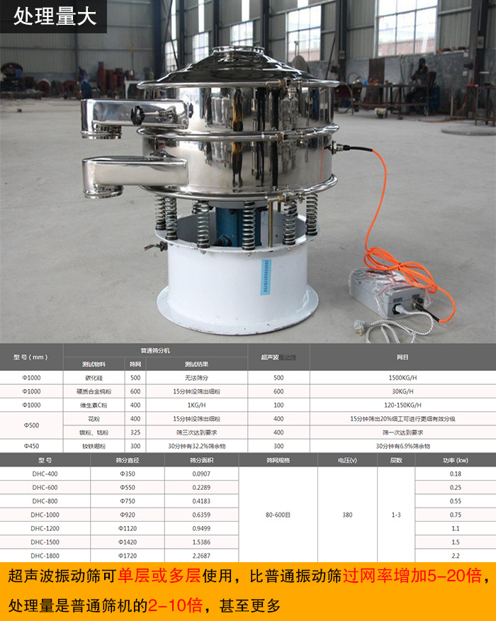 超聲波振動篩可單層或多層使用,比普通振動篩過網(wǎng)率增加5-20倍,處理量是普通篩機的2-10倍,甚至更多。