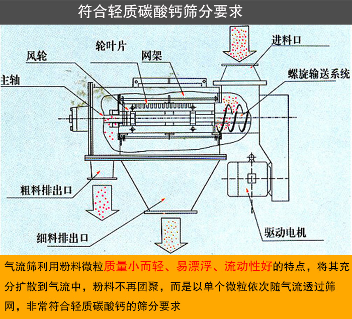 氣流篩利用粉料微粒質(zhì)量小而輕、易漂浮、流動性好的特點,將其充分擴散到氣流中,粉料不再團聚,而是以單個微粒依次隨氣流透過篩網(wǎng),非常符合輕質(zhì)碳酸鈣的篩分要求。