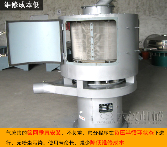 氣流篩的篩網(wǎng)垂直安裝,不負重,篩分程序在負壓半循環(huán)狀態(tài)下進行,無粉塵污染,使用壽命長,減少降低維修成本。