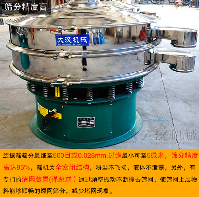 旋振篩篩分細(xì)至500目或0.028mm,過(guò)濾小可至5微米,篩分精度高達(dá)95%,篩機(jī)為全密閉結(jié)構(gòu),粉塵不飛揚(yáng),液體不泄露,另外,有專門(mén)的清網(wǎng)裝置(彈跳球)通過(guò)頻率振動(dòng)不斷撞擊篩網(wǎng),使篩網(wǎng)上層物料能夠順暢的透網(wǎng)篩分,并有效解決了物料堵網(wǎng)問(wèn)題出現(xiàn),減少篩網(wǎng)堵塞對(duì)篩分精度的影響。