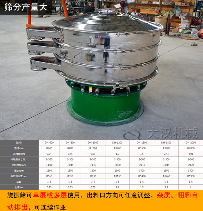 以上是鉛粉振動(dòng)篩的先關(guān)介紹。另外,大漢旋振篩旋振篩分機(jī)按型號(hào)劃分有DH-400、DH-600、DH-800、DH-1000、DH-1200、DH-1500、DH-1800等等,還可根據(jù)客戶所篩物料的特殊要求分為普通旋振篩、閘門(mén)式旋振篩、加緣式旋振篩,滿足更多用戶的需求,如需了解鉛粉旋振篩價(jià)格等信息,可隨時(shí)點(diǎn)擊在線咨詢,新鄉(xiāng)大漢24小時(shí)為您服務(wù)。