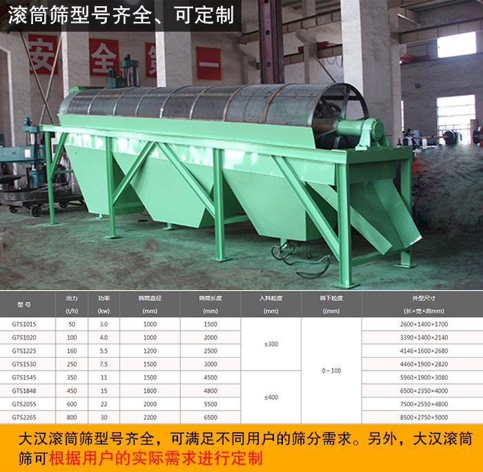 新鄉(xiāng)大漢滾筒篩型號(hào)有GTS1015、GTS1020、GTS1225、GTS1530、GTS1545、GTS1848、GTS2055、GTS2265等。不同型號(hào)的滾筒篩,其處理能力是不同的,大漢滾筒篩型號(hào)齊全,可滿(mǎn)足不同用戶(hù)的篩分需求。另外,大漢滾筒篩可根據(jù)用戶(hù)的實(shí)際需求進(jìn)行定制。