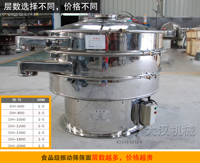 大漢機(jī)械推薦一款專門用于食品行業(yè)的振動(dòng)篩,即食品振動(dòng)篩,食品振動(dòng)篩對(duì)衛(wèi)生標(biāo)準(zhǔn)要求比較嚴(yán)格,所以整機(jī)采用304不銹鋼材質(zhì)。該設(shè)備干凈、衛(wèi)生、無(wú)死角,全部進(jìn)行剖光處理,完全達(dá)到食品衛(wèi)生標(biāo)準(zhǔn)。新鄉(xiāng)大漢一臺(tái)食品振動(dòng)篩價(jià)格在6000~15000元之間。但是不同型號(hào)、層數(shù)等不同,價(jià)格也會(huì)相應(yīng)有所變化。