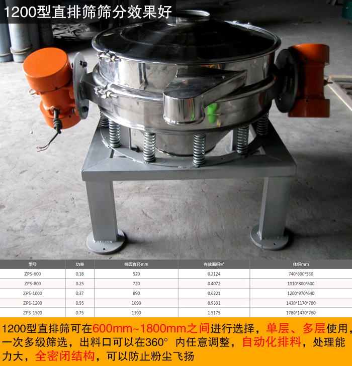 1200型直排篩的兩臺振動電機對稱安裝在直排篩兩側(cè),振動電機上、下端裝有偏心重錘將振動電機的旋轉(zhuǎn)運動變?yōu)樗?、垂直、傾斜以及離心作用的多作用力重疊,再將這種作用力傳遞給篩面,從而達到篩分的目的。1200型直排篩可在600mm~1800mm之間進行選擇,單層、多層使用,一次多級篩選,出料口可以在360°內(nèi)任意調(diào)整,自動化排料,處理能力大,全密閉結(jié)構(gòu),可以防止粉塵飛揚。