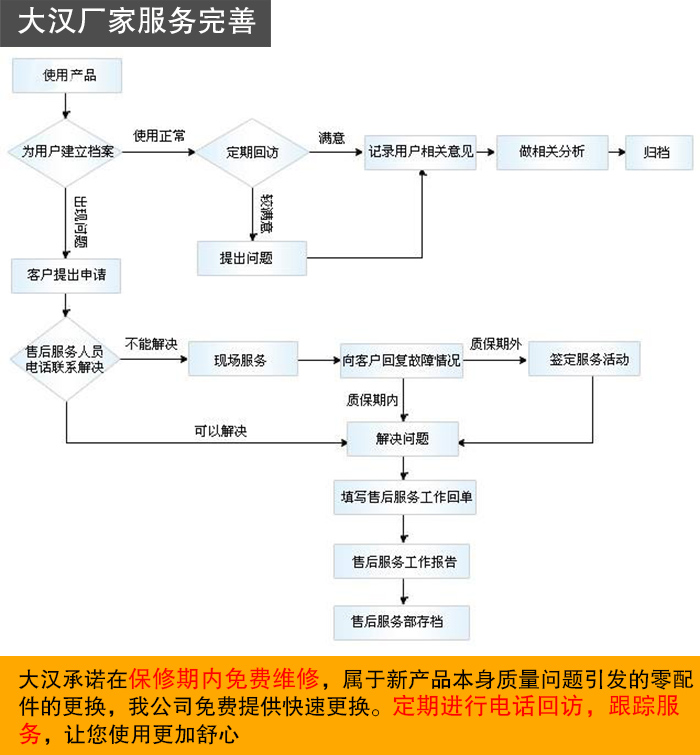 新鄉(xiāng)大漢從售前、售中、售后始終堅持把每一細節(jié)做到全面細致,以便快速有效解決用戶所需,而且大漢承諾在保修期內(nèi)免費維修,屬于新產(chǎn)品本身質(zhì)量問題引發(fā)的零配件的更換,我公司免費提供快速更換。定期進行電話回訪,跟蹤服務(wù),讓您使用更加舒心。大漢完善的服務(wù)渠道和嚴密的服務(wù)程序,能為您提供優(yōu)質(zhì)的服務(wù)。