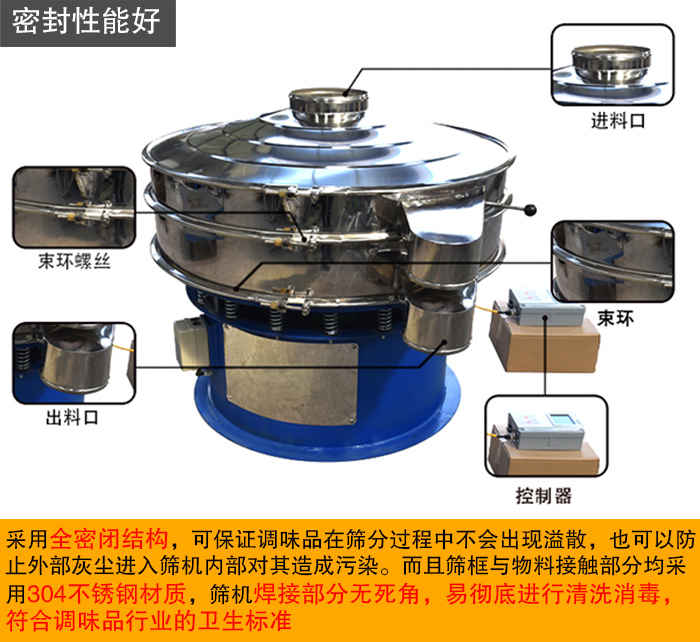 三次元振動(dòng)篩采用全密閉結(jié)構(gòu),可保證調(diào)味品在篩分過(guò)程中不會(huì)出現(xiàn)溢散,也可以防止外部灰塵進(jìn)入篩機(jī)內(nèi)部對(duì)其造成污染。而且篩框與物料接觸部分均采用304不銹鋼材質(zhì),篩機(jī)焊接部分無(wú)死角,易進(jìn)行清洗消毒,符合調(diào)味品行業(yè)的衛(wèi)生標(biāo)準(zhǔn)。
