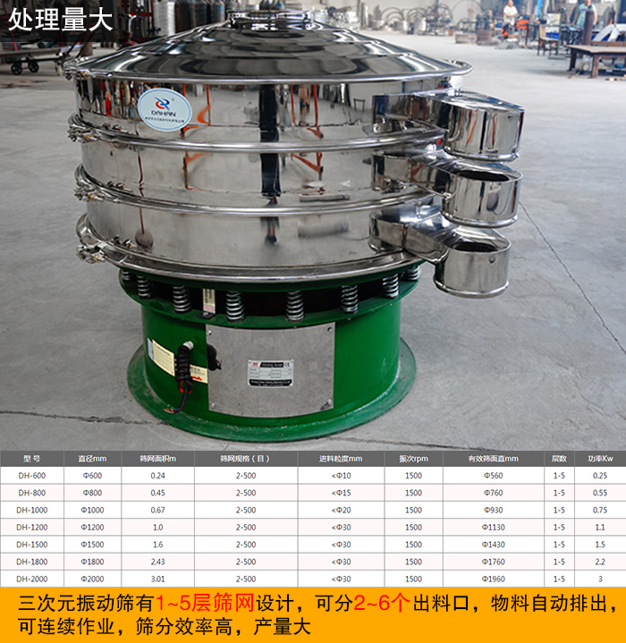 三次元振動(dòng)篩有1~5層篩網(wǎng)設(shè)計(jì),可分2~6個(gè)出料口,物料自動(dòng)排出,可連續(xù)作業(yè),篩分效率高,產(chǎn)量大,可滿足不同用戶對(duì)調(diào)味品產(chǎn)量的要求。