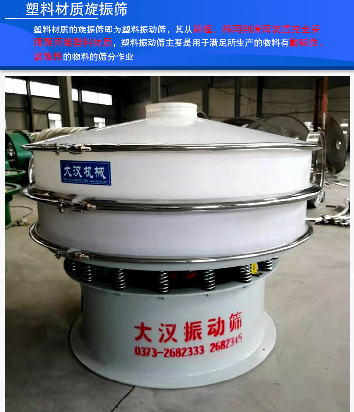 塑料材質(zhì)的旋振篩即為塑料振動(dòng)篩,其從篩框、篩網(wǎng)到清網(wǎng)裝置完全采用聚丙烯塑料材質(zhì),塑料振動(dòng)篩主要是用于滿足所生產(chǎn)的物料有酸堿性、腐蝕性的物料的篩分作業(yè),排除了一些特殊物料與金屬接觸會(huì)產(chǎn)生化學(xué)反應(yīng)的問(wèn)題。