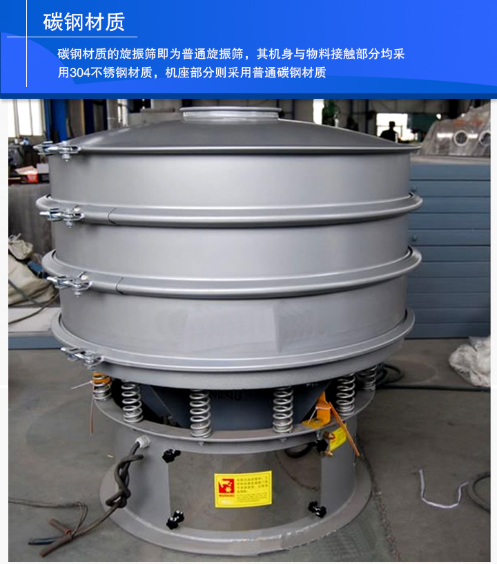 碳鋼材質(zhì)的旋振篩即為普通旋振篩,其機(jī)身與物料接觸部分均采用304不銹鋼材質(zhì),機(jī)座部分則采用普通碳鋼材質(zhì)。旋振篩可以篩分500目或或0.028mm的顆粒,過(guò)濾500目漿液。