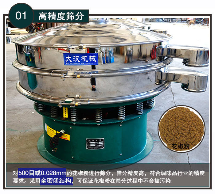 旋振篩可以對500目或0.028mm的花椒粉進行篩分,篩分精度高,符合調(diào)味品行業(yè)的精度要求。采用全密閉結(jié)構(gòu),可保證花椒粉在篩分過程中不會被污染,進一步可以提高篩分精度。