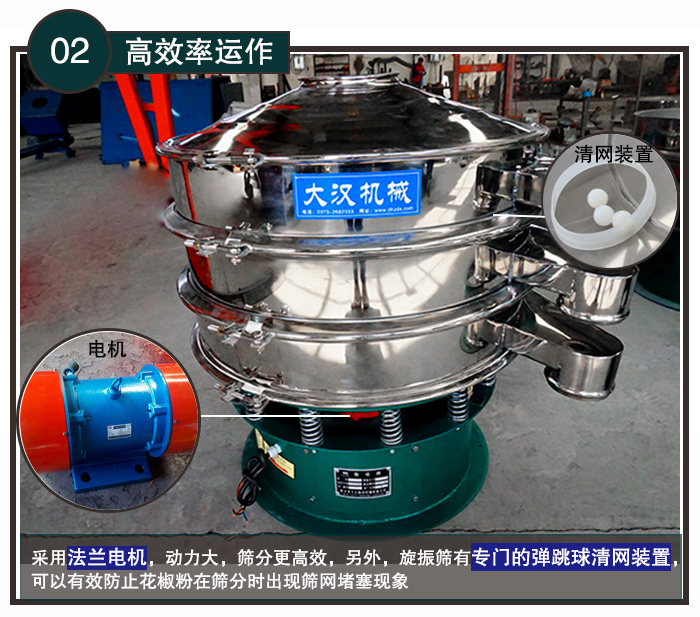 旋振篩采用法蘭電機,動力大,篩分更高效,另外,旋振篩有專門的彈跳球清網(wǎng)裝置,可以有效防止花椒粉在篩分時出現(xiàn)篩網(wǎng)堵塞現(xiàn)象的發(fā)生,提高篩分效率。