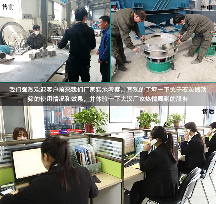 新鄉(xiāng)大漢擁有一系列完善的售前,售中,售后服務(wù)體系,實(shí)現(xiàn)與用戶的高效對(duì)接,此外,我們強(qiáng)烈歡迎客戶前來我們廠家實(shí)地考察,直觀的了解一下關(guān)于石灰振動(dòng)篩的使用情況和效果,并體驗(yàn)一下大漢廠家熱情周到的服務(wù)。