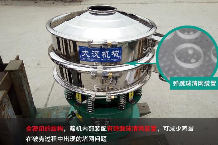 不銹鋼振動篩采用了全密閉的結(jié)構(gòu),篩機(jī)內(nèi)部裝配有彈跳球清網(wǎng)裝置,可以在篩機(jī)工作時(shí)對篩面進(jìn)行清潔處理,減少雞蛋在破殼過程中出現(xiàn)的堵網(wǎng)問題,進(jìn)一步提高其篩分效率。