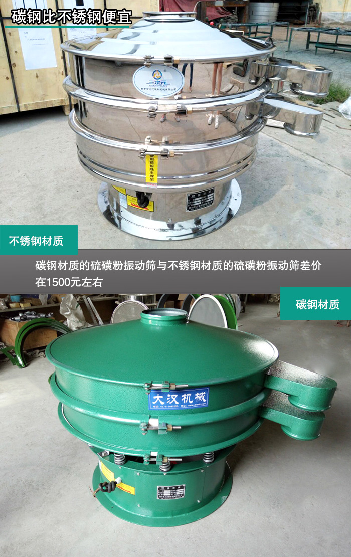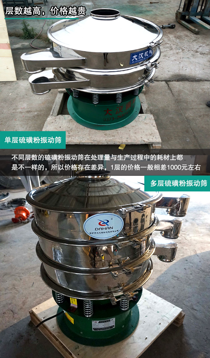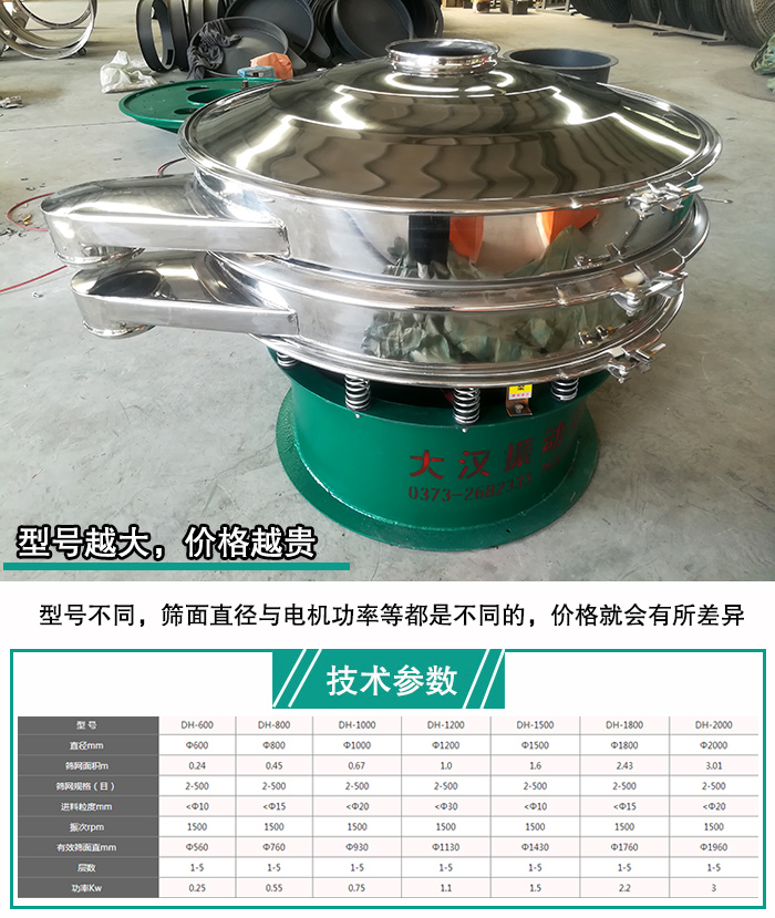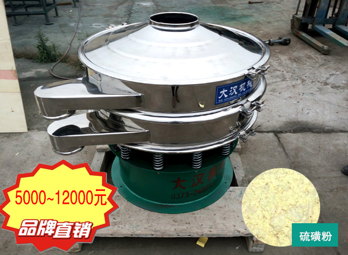 大漢硫磺粉振動篩型號有DH600、DH800、DH1000、DH1200、DH1500、DH1800、DH2000,型號不同的硫磺粉振動篩篩面直徑與電機功率等都是不同的,所以不同型號的硫磺粉振動篩機價格是不同的。