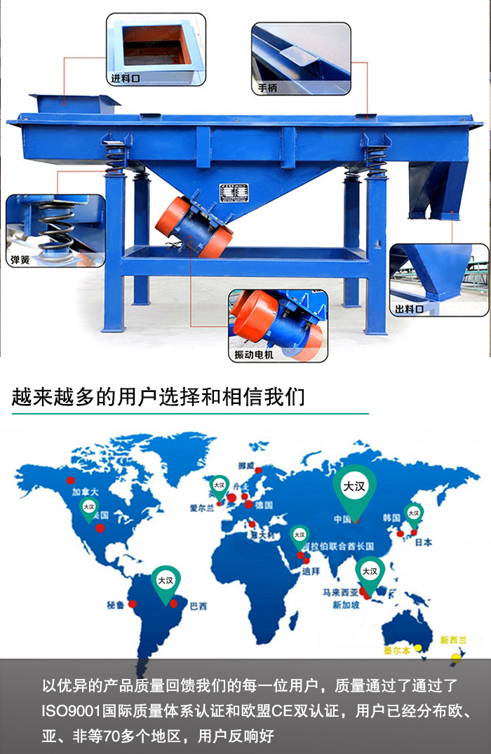 新鄉(xiāng)大漢廠家始終將用戶權益擺在首位,杜絕一切低劣產(chǎn)品,材質(zhì)優(yōu)中選優(yōu),對每一臺直線振動篩進行嚴格的質(zhì)量管理,大漢直線振動篩通過了ISO9001國際質(zhì)量體系認證和歐盟CE雙認證,堅持以優(yōu)異的產(chǎn)品質(zhì)量回饋我們的每一位用戶,在其研發(fā)能力、制造能力、產(chǎn)品質(zhì)量均處于國內(nèi)和貼近國際水平的情況下,越來越多的用戶選擇和相信我們,從目前來看,新鄉(xiāng)大漢用戶已經(jīng)分布歐、亞、非等70多個地區(qū),用戶反響一致很好。