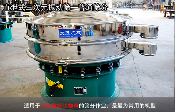 直泄式三次元振動(dòng)篩即普通型三次元振動(dòng)篩,該種類型的三次元振動(dòng)篩設(shè)備主要適用于大多數(shù)粉狀物料的篩分作業(yè),是常用的機(jī)型。