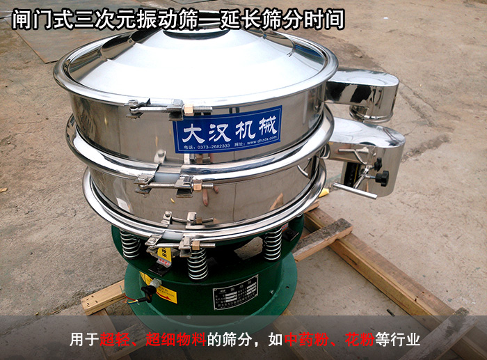 該種類型的三次元振動(dòng)篩是在實(shí)際應(yīng)用中衍生出來的一種產(chǎn)品,是在普通型三次元振動(dòng)篩出料口處加裝閘門,主要是在篩分物料中的雜質(zhì)時(shí)使用,通過關(guān)閉出料口使物料進(jìn)行充分篩分。用戶可以一次投料長(zhǎng)久篩分作業(yè),通過控制閘門的開合以達(dá)到良好篩分的目的,這種篩分作業(yè)多用于超輕、超細(xì)物料的篩分,如中藥粉、花粉等行業(yè)。