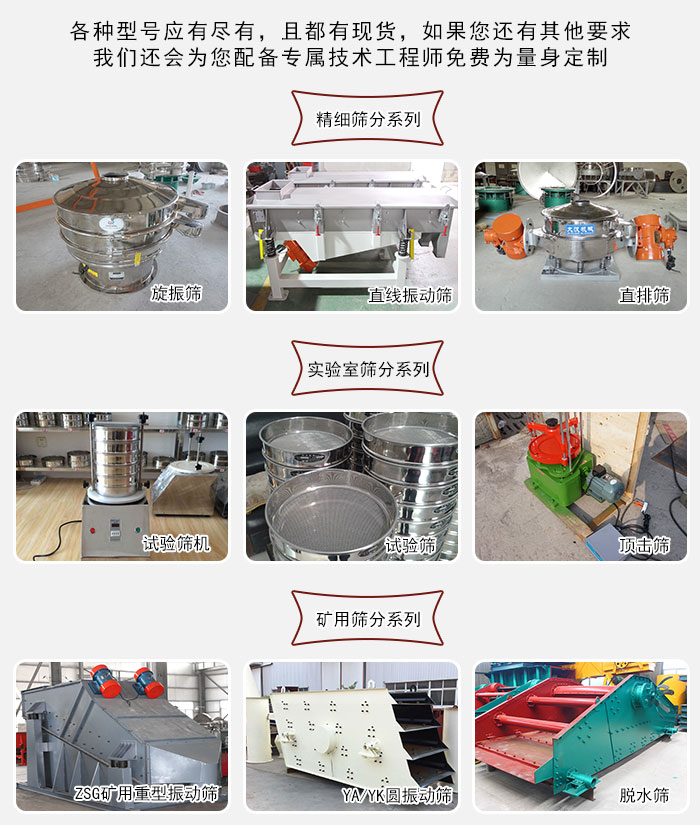 大漢廠家生產(chǎn)的振動篩主要針對精細篩分,實驗室篩分,礦用篩分等多種不同的場景,該設(shè)備種類型號多樣,有幾百種型號可供您選擇,且都有現(xiàn)貨,如果您還有其他要求,我們還會為您配備專屬技術(shù)工程師免費為量身定制。