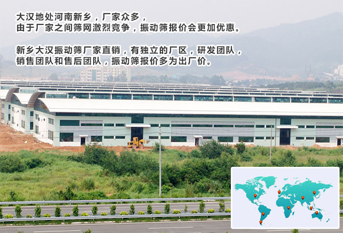 河南新鄉(xiāng)市是生產(chǎn)振動篩的基地,被譽為“振動篩之鄉(xiāng)”,就新鄉(xiāng)市而言,生產(chǎn)振動篩設(shè)備的廠家大大小小就有上千家,是個選購振動篩的好去處。但是這其中也不乏一些小作坊,所以建議大家在選購振動篩設(shè)備時還是實地參觀為妙。這里為您推薦我們新鄉(xiāng)大漢振動機械有限公司: