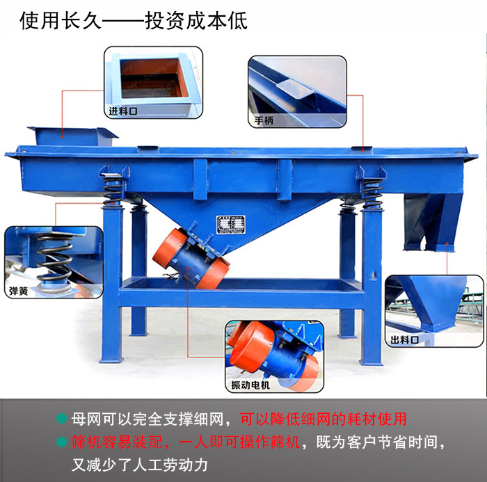 直線振動篩采用獨特的篩網(wǎng)結(jié)構(gòu)設(shè)計,其母網(wǎng)可以完全支撐細網(wǎng),因此細網(wǎng)使用壽命長,從而可以降低細網(wǎng)的耗材使用,而且篩網(wǎng)更換方便和快速,只需3-5分鐘,并且篩機容易裝配,一人即可操作篩機,既為客戶節(jié)省時間,又減少了人工勞動力,減少用戶的投資成本。