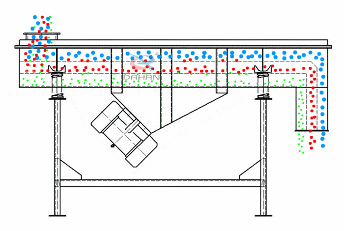 木屑直線振動篩利用兩臺振動電機反向旋轉(zhuǎn),使激振器產(chǎn)生反向激振力,并帶動篩箱做前后直線運動,當木屑從直線振動篩一端的進料口進入篩箱,均勻分布在篩面上,在激振力和自重的合力作用下,使其在篩面上被拋起,并向出料口跳躍式前進,后通過各層孔徑大小不一的篩網(wǎng)實現(xiàn)對木屑的篩分、分級,木屑由每層對應(yīng)的出料口排出,從而完成整個篩分過程。