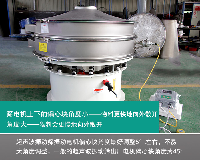 改善出料慢還可以通過調(diào)整超聲波振動篩電機(jī)上下偏心塊角度實現(xiàn)。如果超聲波振動篩電機(jī)上下的偏心塊角度小,會使篩面上的物料更快地向外散開,角度變大的話,則物料會更慢地向外散開。