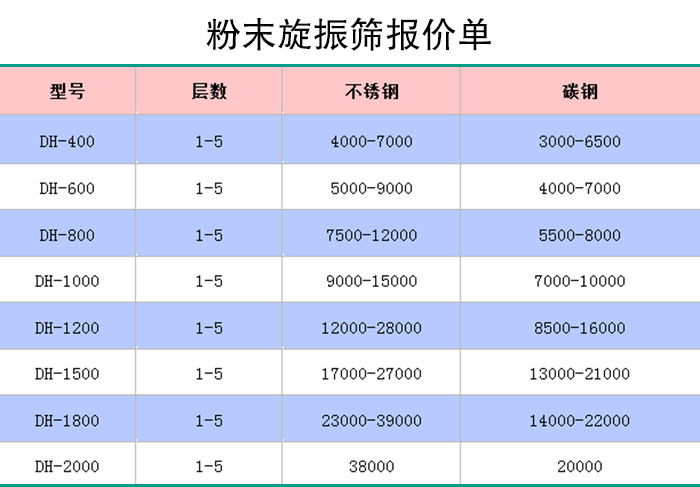 大漢一臺(tái)粉末振動(dòng)篩價(jià)格在4000~22000元之間,詳細(xì)可參考下列表格: