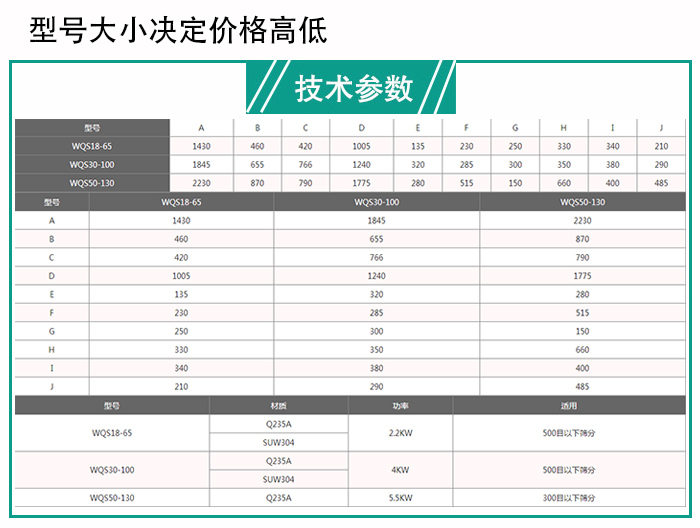 大漢臥式氣流篩型號包括WQS18-65型、WQS30-100型、WQS50-130型,每種型號之間的臥式氣流篩對應(yīng)的電機(jī)功率是不一樣的,所以參數(shù)配置方面也有所不同,這對臥式氣流篩價格會造成一定的影響。