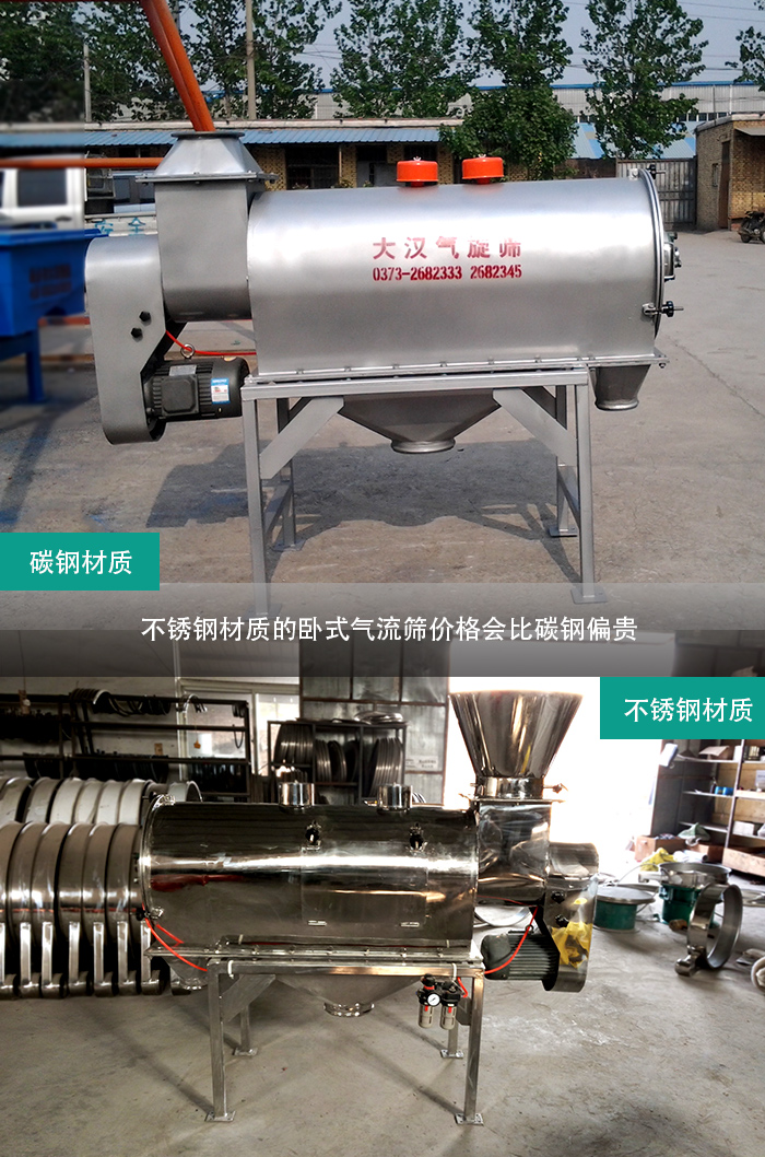 臥式氣流篩材質(zhì)分為不銹鋼和碳鋼兩種,不銹鋼材質(zhì)含有合金元素的鋼材,防腐性能好,所以,在同種型號下,不銹鋼材質(zhì)的臥式氣流篩價格會比碳鋼材質(zhì)的偏貴一點。