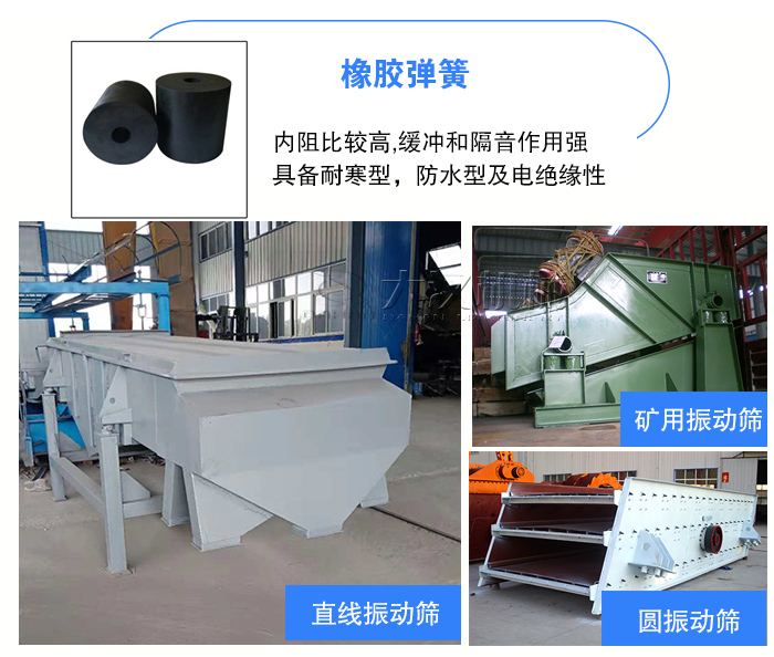 橡膠彈簧一般用于直線振動篩,不銹鋼振動篩,圓振動篩,礦用振動篩中。