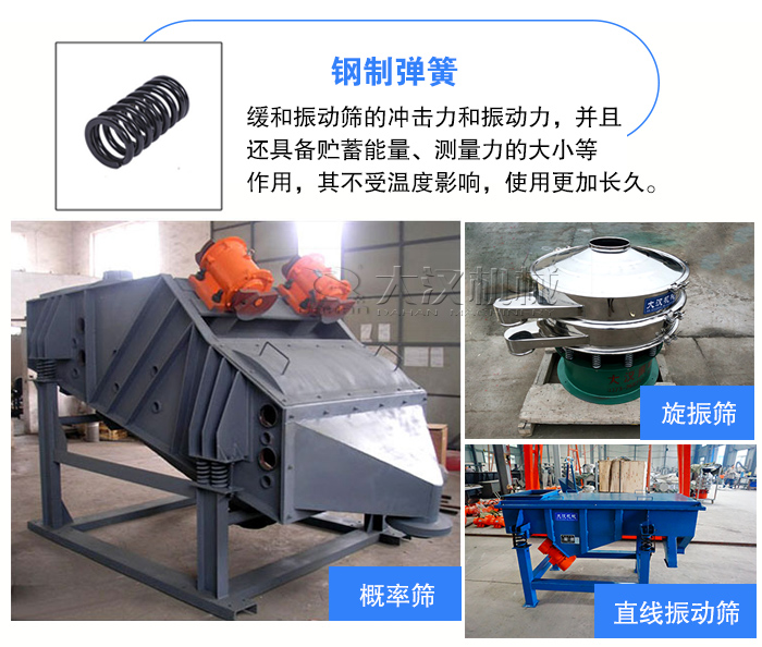 鋼制彈簧一般是用在旋振篩、不銹鋼振動篩、直線振動篩篩、概率篩等設備中。