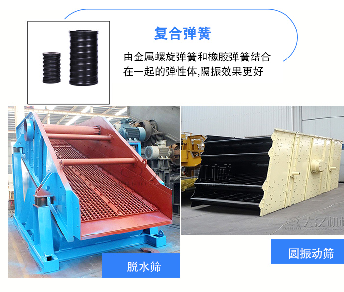 復合彈簧是由金屬螺旋彈簧和橡膠彈簧結合在一起的彈性體,集金屬彈簧和橡膠彈簧的優(yōu)點于一體,并克服兩者的缺點,隔振效果更好,適用于礦山、冶金、煤炭等行業(yè)的大型振動設備,如圓振動篩,脫水篩設備中。