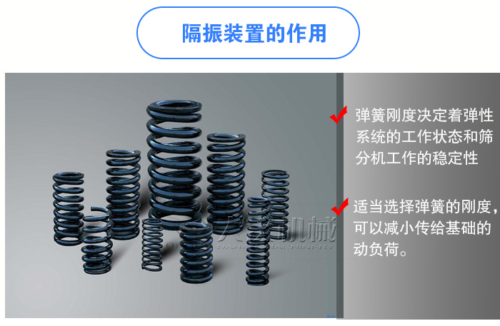 鋼制彈簧可以控制篩機的運動,緩和振動篩的沖擊力和振動力,并且還具備貯蓄能量、測量力的大小等作用,其不受溫度影響,使用更加長久。