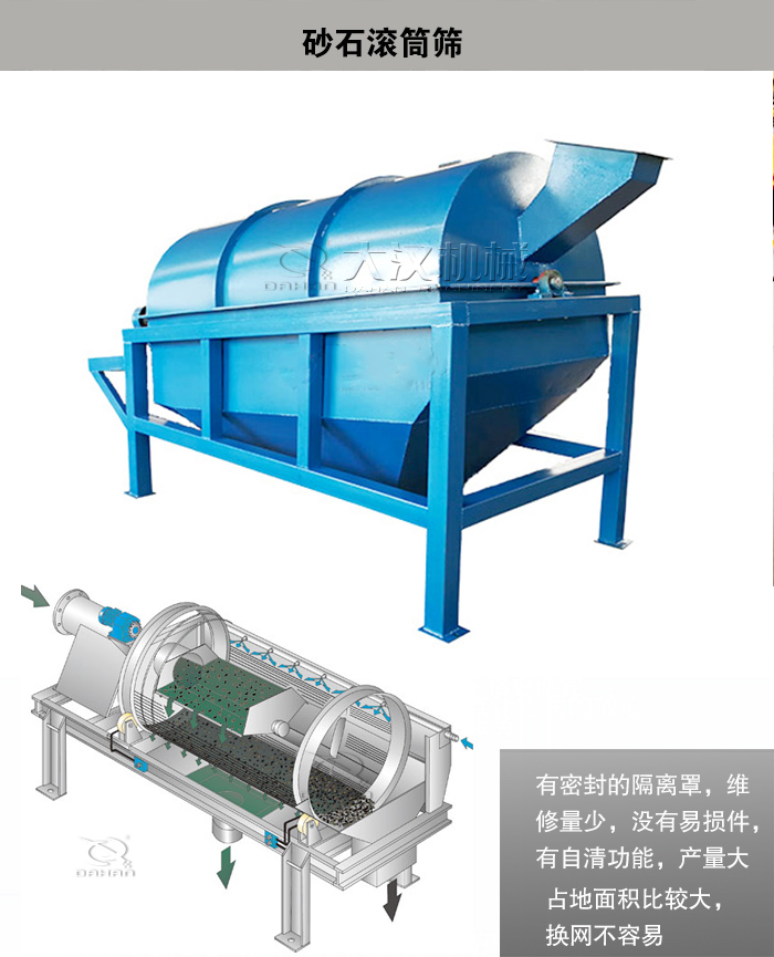 優(yōu)勢:滾筒篩外部設(shè)置有密封的隔離罩,可以降低砂石在篩分過程中的塵土對環(huán)境造成的影響,另外,滾筒篩內(nèi)部還有梳型清潔裝置,可以有效解決篩網(wǎng)堵塞的情況,其產(chǎn)量也比較大,每小時產(chǎn)量范圍在50-800噸/時。