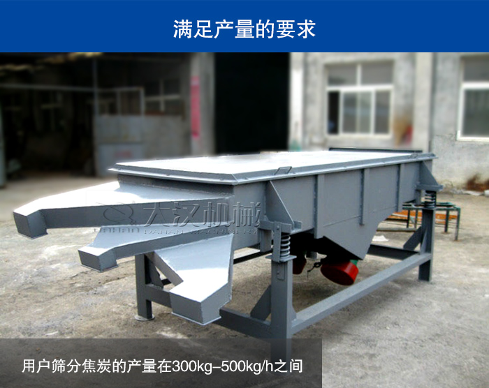 用戶篩分焦炭的產(chǎn)量在300kg-500kg/h之間,1020型直線振動篩產(chǎn)量可以達(dá)到300kg/h,大漢1030型雙層直線振動篩產(chǎn)量可以達(dá)到500kg/h,在現(xiàn)場使用過程中,完全可以滿足生產(chǎn)線上的需求。