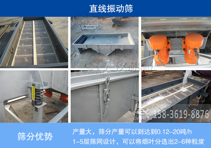 篩分優(yōu)勢(shì):產(chǎn)量大,適合流水線生產(chǎn),此類振動(dòng)篩可以篩分粒度在0.074—5mm,含水量小于7%,無粘性的各種干式粉狀或顆粒狀物料,篩分產(chǎn)量可以到達(dá)到0.12-20噸/h。也有1-5層篩網(wǎng)設(shè)計(jì),可以將煙葉分選出2-6種粒度規(guī)格。