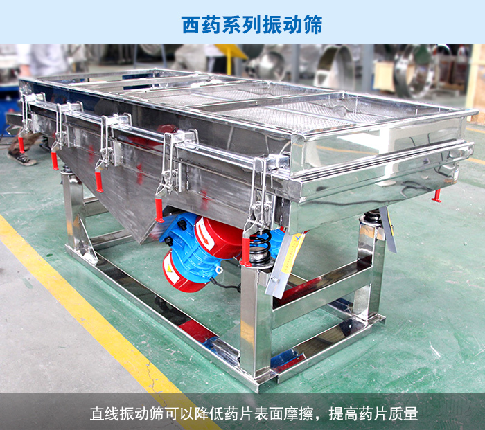 由于西藥多為片狀,外表呈光澤的硬殼狀,所以在篩分過程中不能使用圓形系列振動篩。這是因為圓形振動篩篩分時物料在篩網停留時間長,這樣就會對藥片表面產生摩擦從而影響外觀。由于這種原因,我們建議使用直線振動篩,對直線篩進行特殊改裝,目的就是讓藥片盡可能的少接觸外面,降低藥片表面摩擦,提高藥片質量。