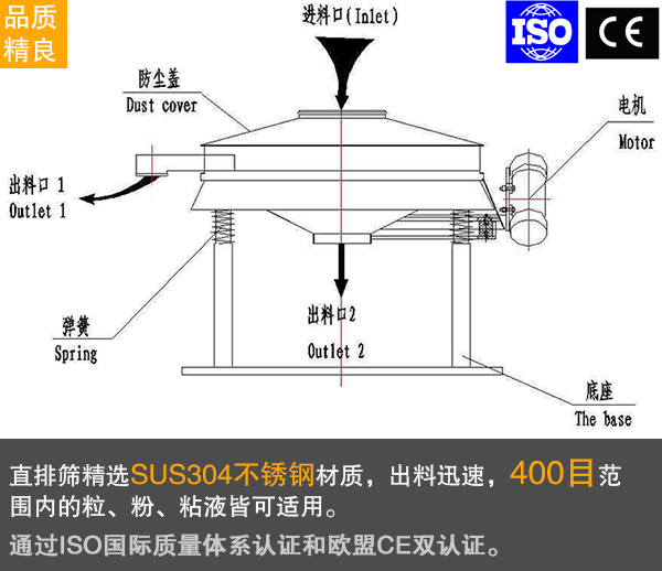 大漢公司以優(yōu)良的產(chǎn)品質(zhì)量,得到國內(nèi)外各界企業(yè)的鼎力支持與信任,并且建廠十余年中,擁有豐富的生產(chǎn)經(jīng)驗,憑借著對設備質(zhì)量的嚴格把關,獲得了業(yè)內(nèi)外朋友的一致好評。產(chǎn)品均已通過ISO9001國際質(zhì)量體系認證和歐盟CE雙認證,產(chǎn)品設備已遠銷至海外30多個國家(如德國,意大利等),用戶可以放心購買。大漢直排篩精選SUS304不銹鋼材質(zhì),物料在篩機中停留時間短,出料迅速,400目范圍內(nèi)的粒、粉、粘液皆可適用。