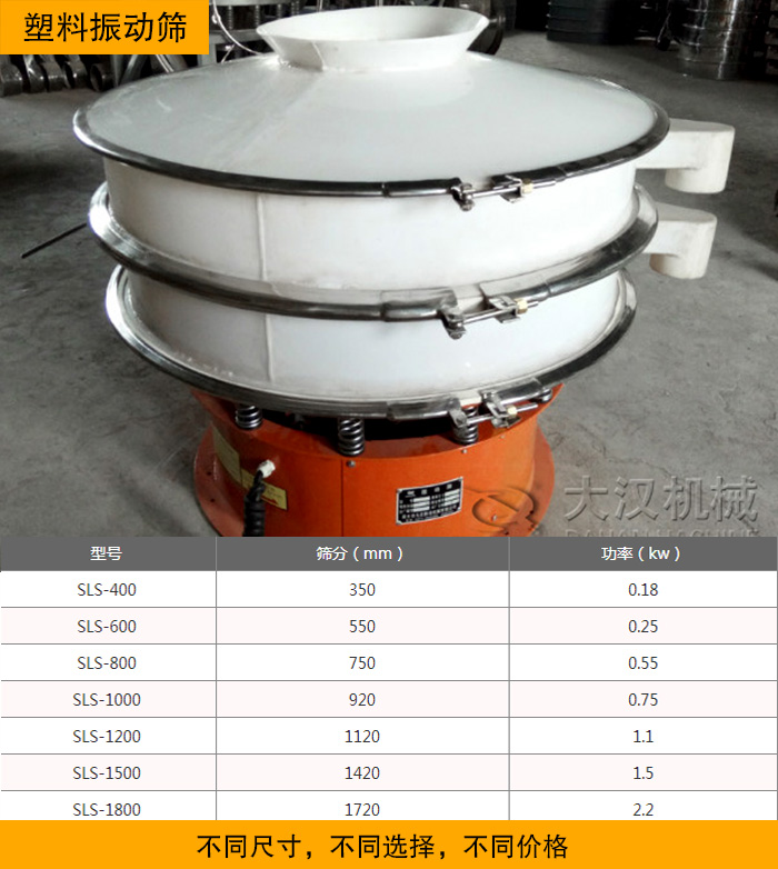不同型號(hào)的塑料振動(dòng)篩,其價(jià)格是不同的。大漢塑料振動(dòng)篩型號(hào)有SLS-400,SLS-600,SLS-800,SLS-1000,SLS-1200,SLS-1400,SLS-1500,SLS-1800。不同型號(hào)的塑料振動(dòng)篩單位時(shí)間內(nèi)處理能力也不一樣。SLS-400塑料振動(dòng)篩的篩分直徑為350mm,而SLS-1800塑料振動(dòng)篩的篩分直徑為1720mm,這就造成兩種型號(hào)的塑料振動(dòng)篩處理能力上具有差異化,因此,這需要根據(jù)用戶的要求進(jìn)行合理選型與設(shè)計(jì)。