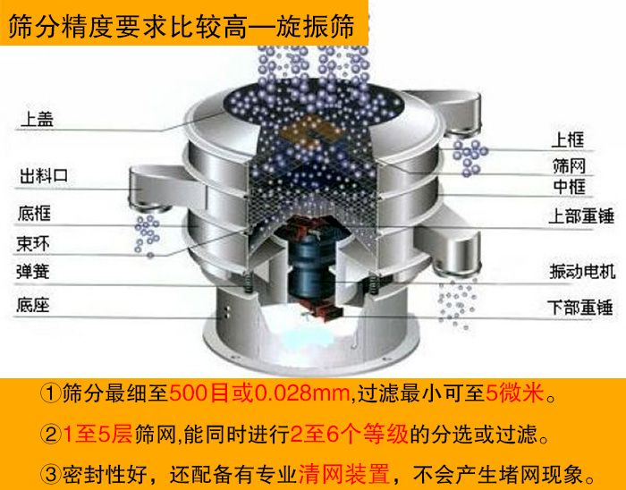 旋振篩作為一種高精度細(xì)粉篩分設(shè)備,篩分物料范圍廣,篩分細(xì)至500目或0.028mm,過(guò)濾小可至5微米。分級(jí)篩選,可篩1至5層篩網(wǎng),能同時(shí)進(jìn)行2至6個(gè)等級(jí)的分選或過(guò)濾,處理量大。密封性好,還配備有專業(yè)清網(wǎng)裝置,在篩分物料的過(guò)程中基本不會(huì)產(chǎn)生堵網(wǎng)現(xiàn)象,極大的提高了篩機(jī)的篩分產(chǎn)量和篩分效率。