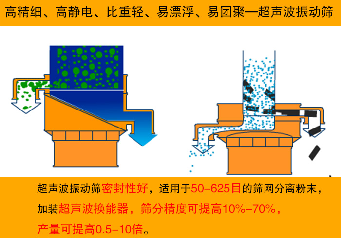 超聲波振動(dòng)篩是旋振篩的衍生產(chǎn)品,超聲波振動(dòng)篩是在普通旋振篩的基礎(chǔ)上進(jìn)行改良,對(duì)于旋振篩不能篩分的細(xì)粉物料,超聲波振動(dòng)篩利用超聲波換能器使篩網(wǎng)表面的高鋁細(xì)粉始終保持懸浮狀態(tài),從而抑制粘附、摩擦、平降等堵網(wǎng)因素,解決了強(qiáng)吸附性、易團(tuán)聚、高靜電、高密度、輕比重等篩分難題。超聲波振動(dòng)篩密封性好,適用于50-625目的篩網(wǎng)分離粉末,篩分精度可提高10%-70%,產(chǎn)量可提高0.5-10倍。