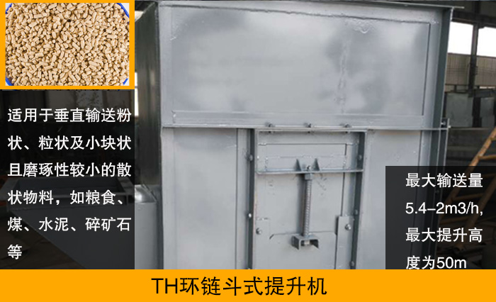 TH系列斗式提升機是一種常用的提升設(shè)備,其主要由由運動部分(料斗與牽引鏈條)、帶有傳動鏈輪的上部區(qū)段、帶有拉緊輪的下部區(qū)段、中間機殼、驅(qū)動裝置、逆止制動裝置等組成,該種類的斗式提升機采用混合式或重力卸料,挖取式裝料。TH型區(qū)別于TD型皮帶斗式提升機,其提升量更大、運轉(zhuǎn)效率更高,大輸送量5.4-2m3/h,大提升高度為50m。